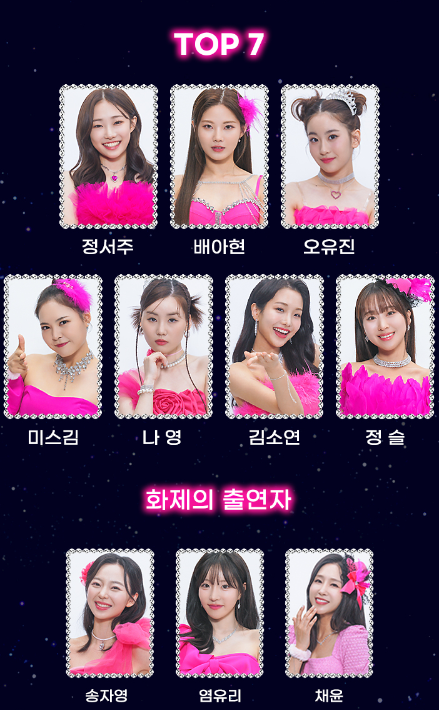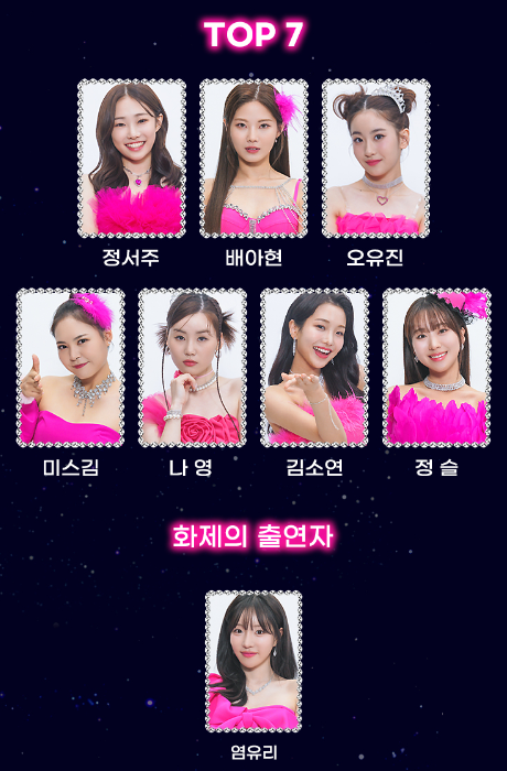 1위를 차지한 정서주는 2008년생 만 15세로 트로트 서바이벌 오디션 프로그램 역대 최연소 우승 기록을 경신했습니다. 기존 기록은 미스터트롯의 임영웅(당시 만 28세)입니다. 2022년 9월에 앨범 '꽃들에게'를 발표하며 데뷔했습니다. 데뷔 전부터 '트로트 샛별 정서주' 유튜브 채널에 다른 가수의 노래를 커버한 영상들을 올려 인기를 끌었습니다. 어린 나이부터 활동하여 주 장르는 트로트이나 발라드, 팝 등 다양한 장르를 노래하고 있습니다.