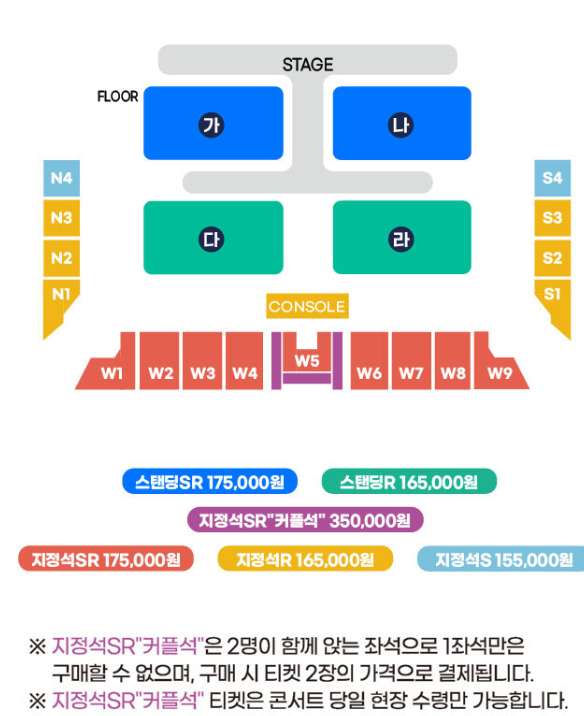 스탠딩SR 175,000원, 스탠딩R 165,000원, 지정석SR"커플석" 350,000원, 지정석SR 175,000원, 지정석R 165,000원, 지정석S 155,000원입니다.