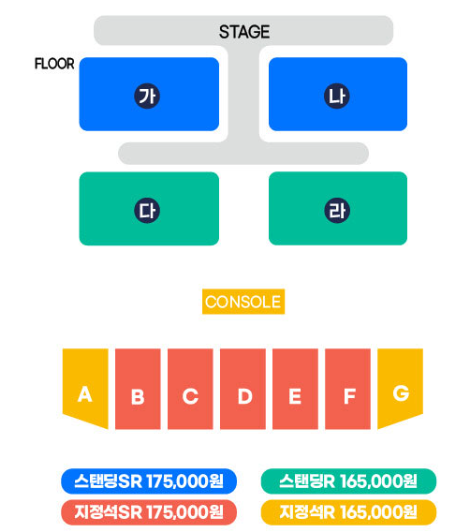 스탠딩 SR 175,000원, 스탠딩R 165,000원, 지정석SR 175,000원, 지정석R 165,000원입니다.